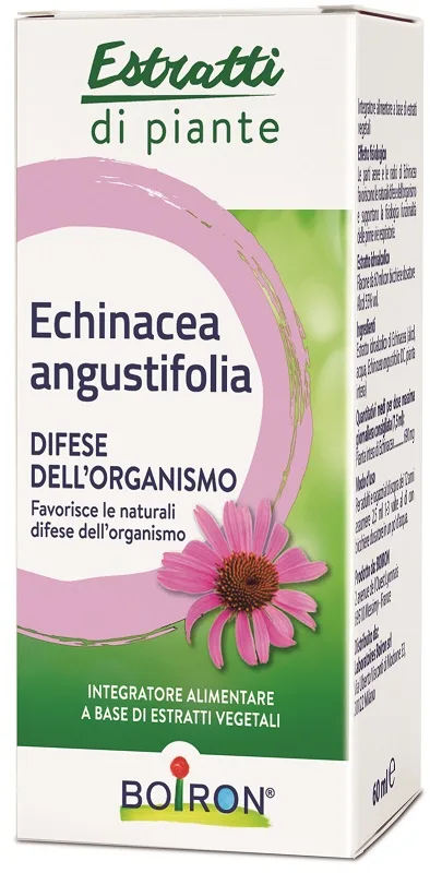 Integratore alimentare a base di estratti vegetali. Estratto idroalcolico. Le parti aeree e le radici di echinacea favoriscono le naturali difese dell’organismo e supportano la fisiologica funzionalità delle prime vie respiratorie.
