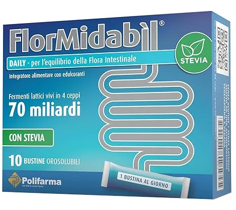 Frutto-oligosaccaridi; edulcoranti: sorbitolo, glicosidi steviolici; formula Flormidabìl Polifarma (Bifidobacterium lactis Bl-04, Lactobacillus acidophilus La14, Lactobacillus plantarum SDZ11, Lactobacillus paracasei SDZ22); agente antiagglomerante: biossido di silicio.