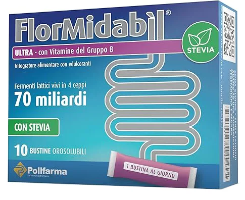 Frutto-oligosaccaridi; edulcoranti: sorbitolo, glicosidi steviolici; formula Flormidabìl Polifarma (Bifidobacterium lactis Bl-04, Lactobacillus acidophilus La-14, Lactobacillus plantarum SDZ-11, Lactobacillus paracasei SDZ-22); agente antiagglomerante: biossido di silicio; vitamina B6 (cloridrato di piridossina); riboflavina; tiammina (mononitrato di tiamina); vitamina B12 (Cianocobalamina).