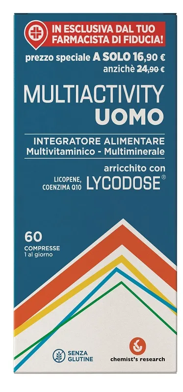 Integratore alimentare completo con vitamine, minerali e Lycodose (complesso bilanciato a base di luteina e licopene), formulato in maniera specifica per sostenere i fabbisogni nutrizionali dell’uomo.