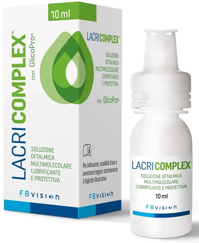 Lacricomplex è una soluzione oftalmica lubrificante, protettiva, idratante, lenitiva e antiossidante, contenente GlicoPro, un complesso multimolecolare a base di proteine, glicosaminoglicani solforati e non solforati veicolato da una base mucinica costituita da idrossipropilmetilcellulosa (HPMC). I glicosaminoglicani, in particolare, costituiscono una parte importante del glicocalice della superficie cellulare, e possono rappresentare dei ligandi per molte molecole come fattori di crescita, citochine, chemochine che modulano la risposta infiammatoria. Lacricomplex contiene pertanto una tripla componente mucinica insieme a una componente mucoproteica e una proteica ad azione lubrificante, idratante, antiossidante e protettiva che risulta utile nel trattamento della secchezza oculare, anche come coadiuvante in presenza di irritazione e infiammazione provocata da condizioni ambientali o da stress meccanici. Lacricomplex, inoltre, favorisce i fisiologici processi riparativi a livello corneale e supporta il ripristino della funzionalità delle terminazioni nervose corneali, che diminuisce in caso di sindrome dell’occhio secco. La soluzione oftalmica è contenuta in un flacone di tipo tecnologico che consente di evitare l’uso di conservanti nel prodotto e permette un’agevole erogazione di tutto il volume di liquido.